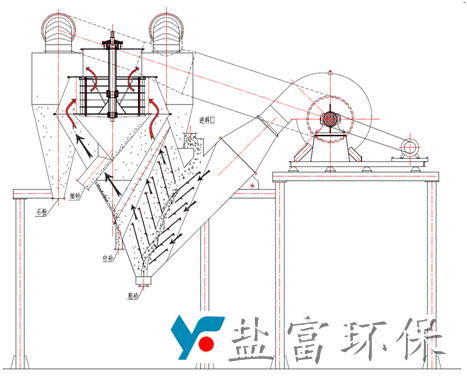 鹽富環(huán)保公司生產(chǎn)的YF-SF復(fù)合選粉機(jī)是將靜態(tài)的V型選粉機(jī)和內(nèi)循環(huán)高效渦流選粉機(jī)有機(jī)結(jié)合,可分級粒徑為4.75mm甚至 粒徑達(dá)10mm以上的物料。來料首先通過靜態(tài)的V選進(jìn)行粗細(xì)分離,中砂和細(xì)砂隨上升的氣流進(jìn)入高效渦流選粉機(jī)進(jìn)行分級,石粉則被旋風(fēng)筒收集。從老式的轉(zhuǎn)子選粉機(jī)只能對機(jī)制砂簡單脫粉到實(shí)現(xiàn)粗、中、細(xì)砂的 分級。
